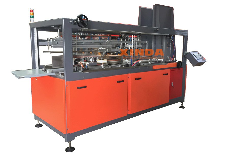 成型紙箱板通過吸盆水平進(jìn)入,然后對(duì)寬面折頁進(jìn)行折合,隨后紙箱長面折頁折合并同時(shí)進(jìn)行底部膠帶黏貼動(dòng)作,最后通過輸送口輸送出紙箱;