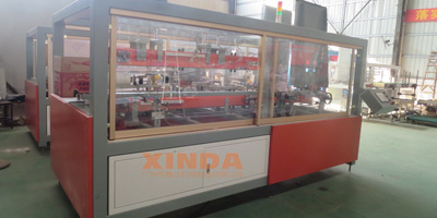 成型紙箱板通過吸盆水平進入,然后對寬面折頁進行折合,隨后紙箱長面折頁折合并同時進行底部膠帶黏貼動作,最后通過輸送口輸送出紙箱;