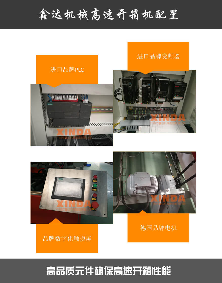 鑫達(dá)機(jī)械高速開(kāi)箱機(jī)目前速度分為12箱立式開(kāi)箱機(jī)、15箱臥式開(kāi)箱機(jī)、25箱臥式開(kāi)箱機(jī)、35箱臥式高速開(kāi)箱機(jī)以及45箱高速開(kāi)箱機(jī)5種速度型號(hào),其中立式開(kāi)箱機(jī)是采用吸盆吸取成型、皮帶傳輸;而臥式高速開(kāi)箱機(jī)統(tǒng)一采用進(jìn)口德國(guó)品牌SEW電機(jī)傳動(dòng)、臺(tái)灣臺(tái)達(dá)伺服電機(jī)成型、德國(guó)費(fèi)斯托真空吸盆,自強(qiáng)鏈條品牌傳輸、西門(mén)子PLC核心控制系統(tǒng);以上高品質(zhì)零配件確保了鑫達(dá)機(jī)械高速開(kāi)箱機(jī)的持續(xù)開(kāi)箱能力達(dá)95%以上,紙箱損壞率在千分之一以?xún)?nèi),采用此款高速成型機(jī),確確實(shí)實(shí)的保證了客戶(hù)的耗材成本。