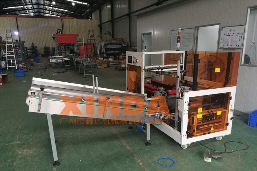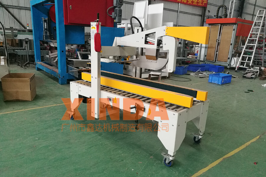 3.折蓋封箱機,此款封箱機是對已經(jīng)裝箱完畢后的產(chǎn)品進行紙箱上部一字型封箱,封箱速度可以達到每分鐘20m;封箱范圍是長度不限,寬度150-500mm,高度是150-500mm,當更換品種時,僅需要調(diào)節(jié)三個手柄即可完成更換;此款封箱機在衛(wèi)生要求高的生產(chǎn)情況下,可以選擇整體不銹鋼材質(zhì)的不銹鋼封箱機進行配套使用;